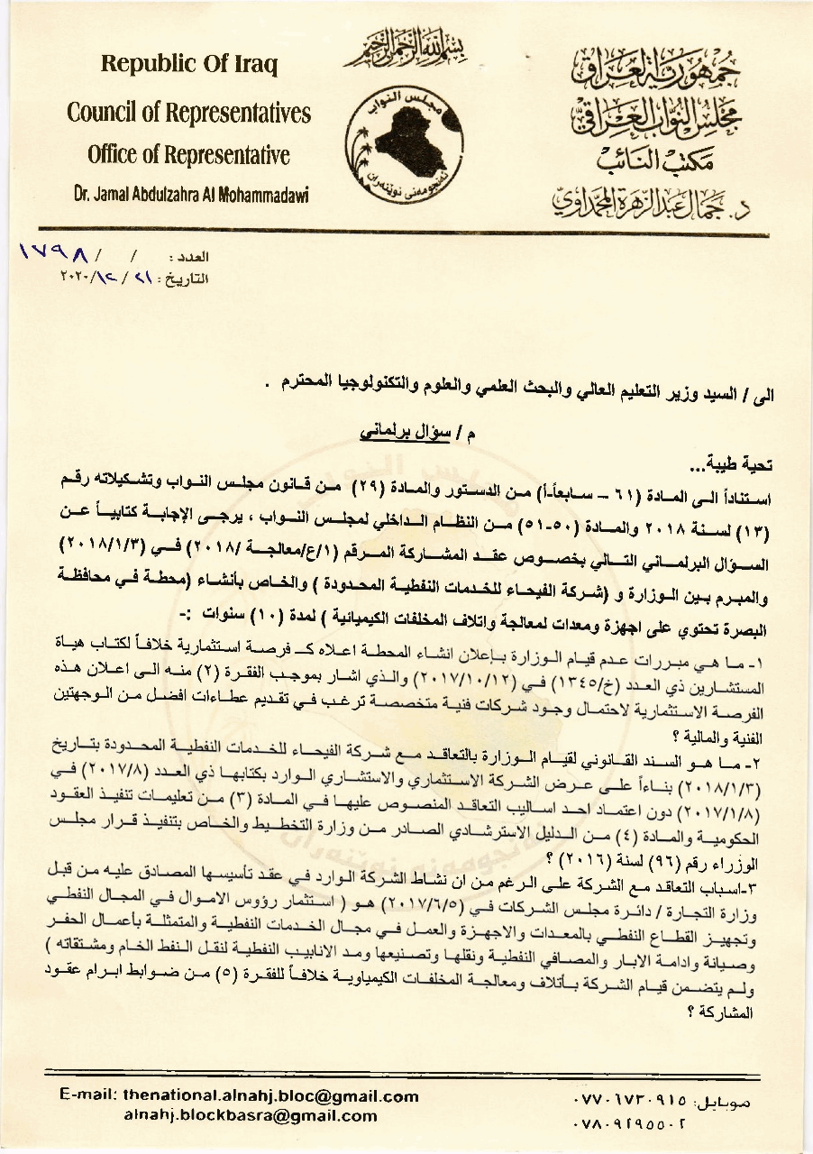 والبحث العلمي بشأن عقد المشاركة المرقم (١/ ٤/معالجة/٢٠١٨) في (٣/ ١/ ٢٠١٨) والمبرم بين الوزارة وشركة