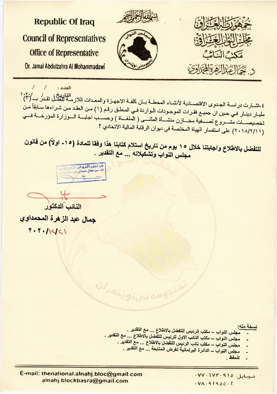 وتابع، أن " دراسة الجدوى الاقتصادية لإنشاء المحطة أشارت إلى أن كلفة الأجهزة والمعدات اللازمة للعمل تقدر ب(٣) مليار دينار في حين جميع فقرات الموجودات في الملحق رقم (١) من العقد من شراءها سابقا من مشروع مخازن منشأة