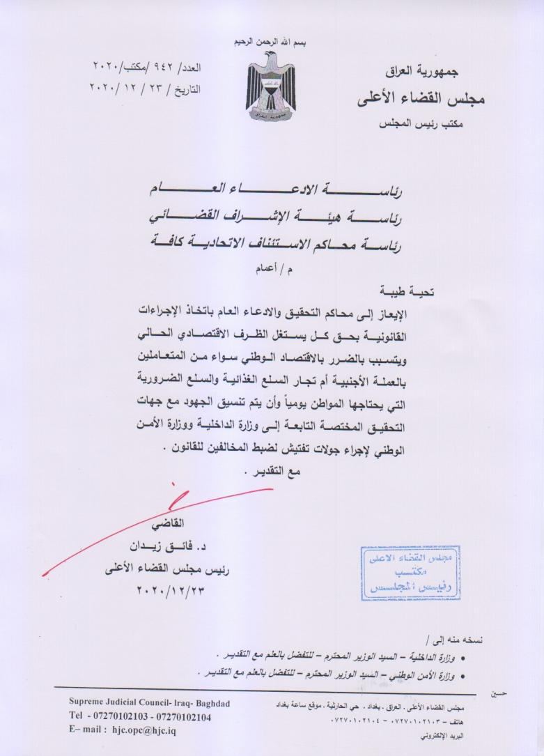 نسخة منه، إن "مجلس القضاء الاعلى وجه بإعمام صادر عنه كافة محاكم التحقيق باتخاذ الاجراءات القانونية بحق كل من تسبب بالضرر بالاقتصاد الوطني سواء من تجار العملة الاجنبية ام التجار المحتكرين للبضائع والسلع الغذائية والسلع الضرورية التي يحتاجها المواطنين يوميا".