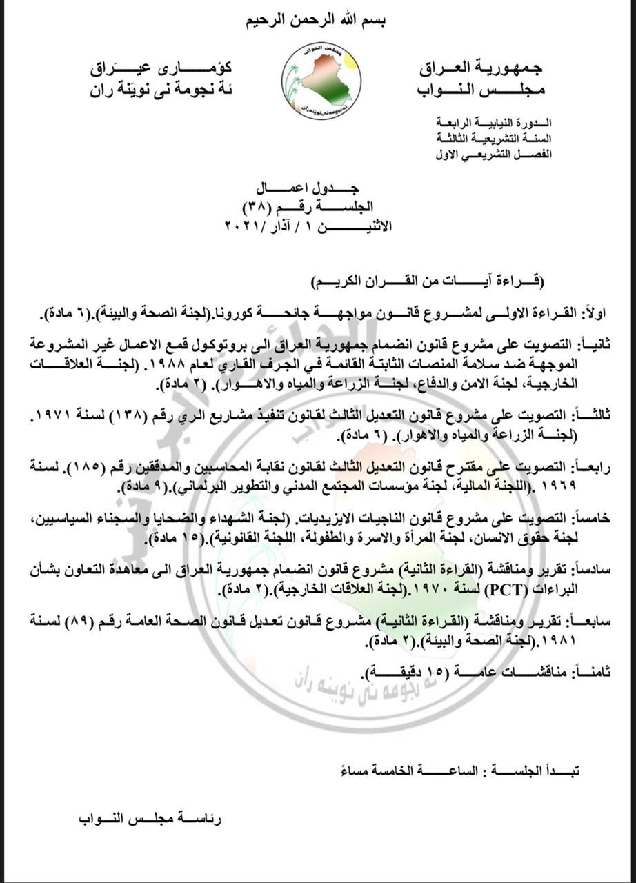، الجمعة، جدول اعمال الجلسة الـ38، المقرر عقدها يوم الاثنين المقبل.
