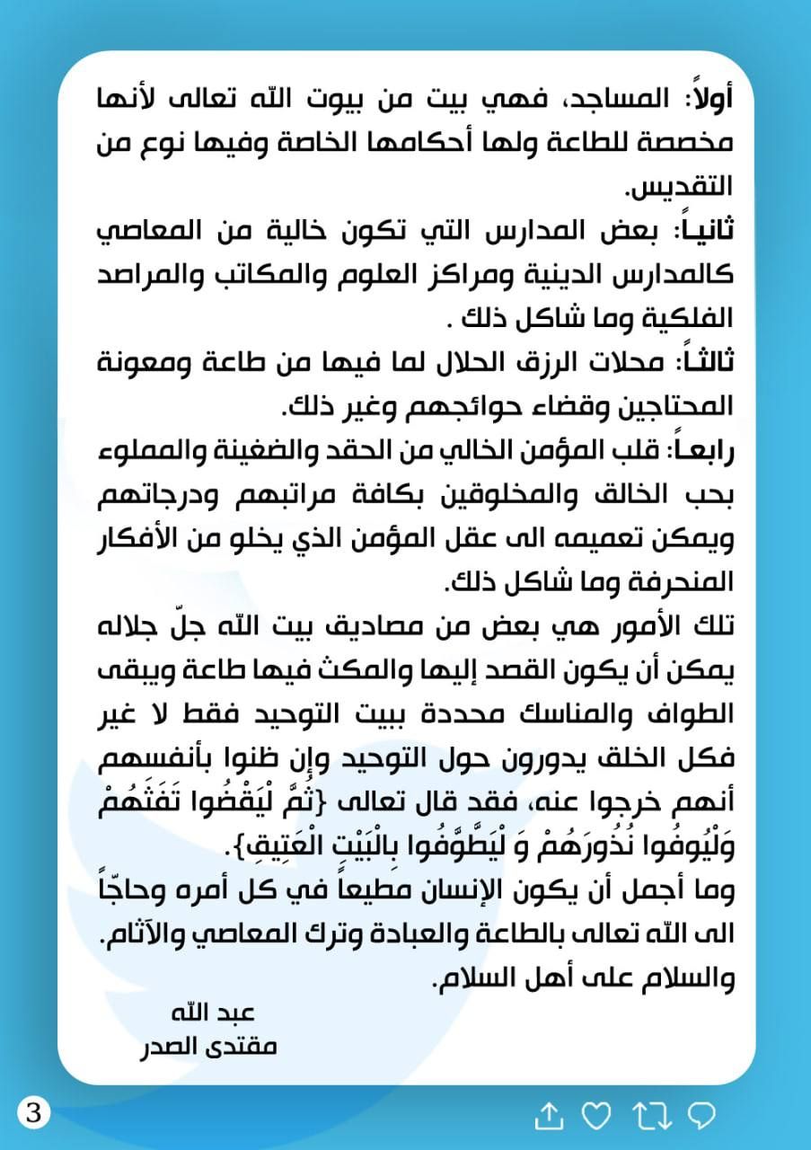 الصدر يشرح في تغريدة المقصود بـ"بيت الله" ويستشهد بنبي الله "ابراهيم"