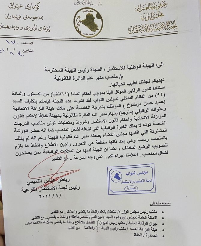 البرلمانية تتضمن اعتراضاً على تسمية مدير عام جديد بهيئة الاستثمار.