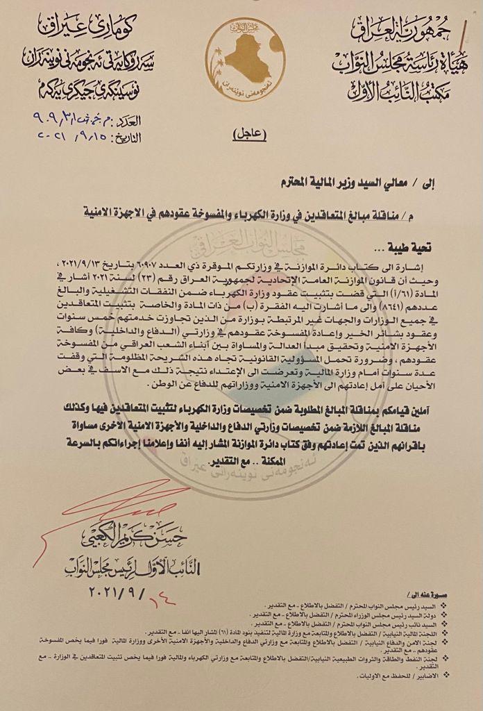 ، طالب الاخير إجراء مناقلة المبالغ المطلوبة لتثبيت المتعاقدين في وزارة الكهرباء والمفسوخة عقودهم في الاجهزة الامنية ضمن تخصيصات وزارات "الكهرباء والدفاع والداخلية و الاجهزة الامنية".