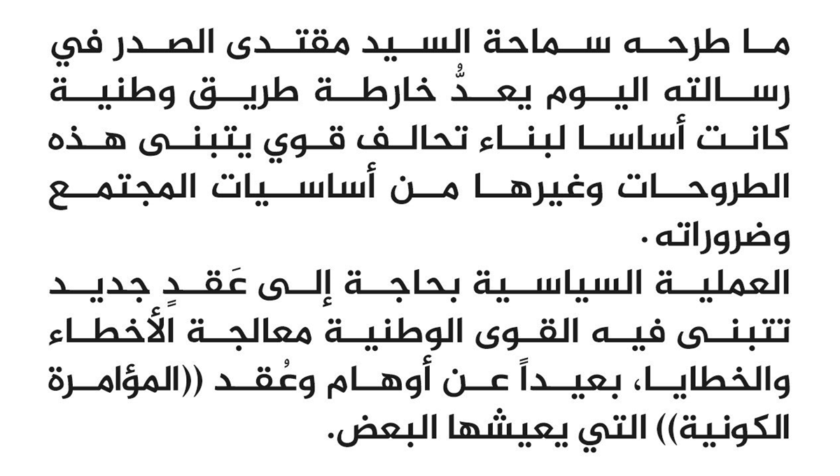 في رسالته اليوم يعد خارطة طريق وطنية كانت اساساً لبناء تحالف قوي يتبنى هذه الطروحات وغيرها من اساسيات المجتمع وضرواته".
