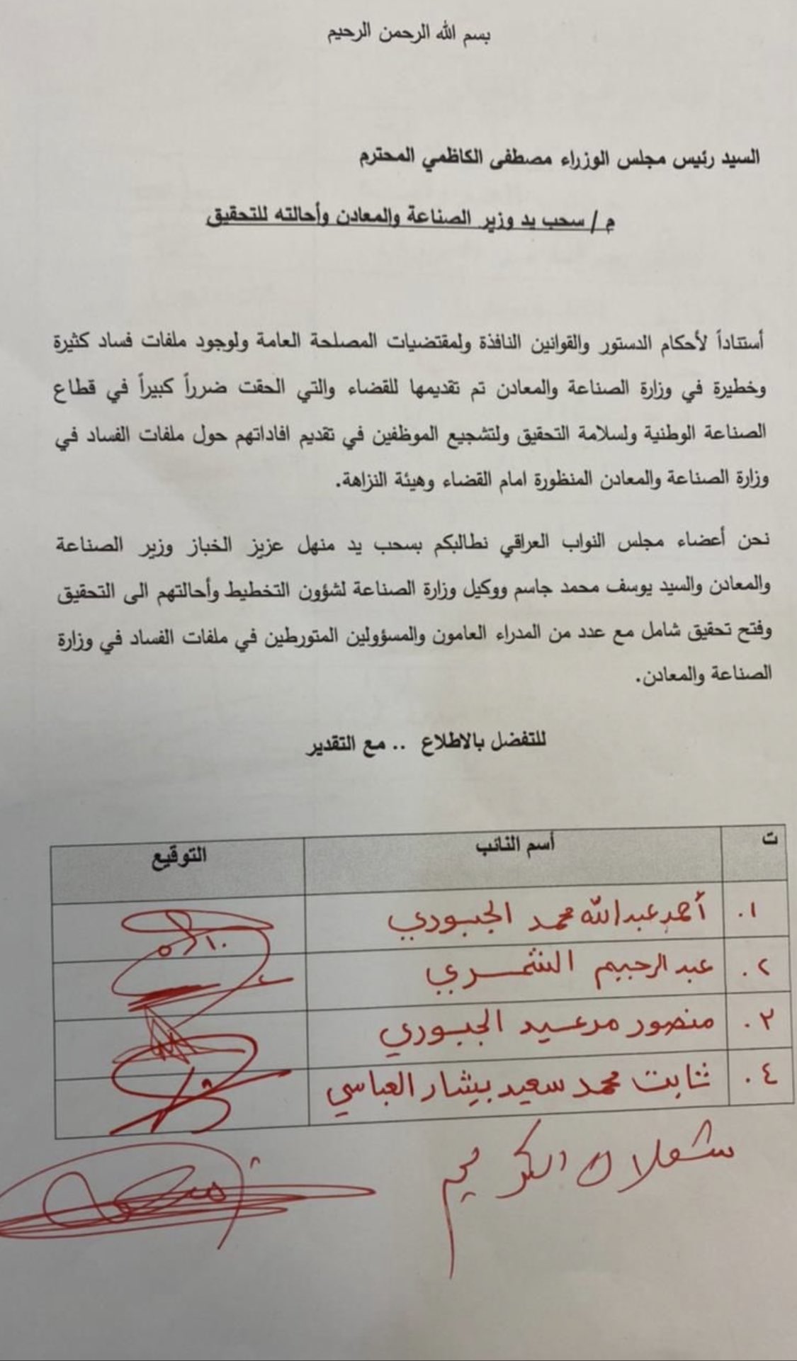 في تغريدة على "تويتر"، "نلفت عناية القضاء العراقي وهيئة النزاهة باكمال التحقيقات الخاصة بملفات الفساد لوزارة الصناعة والتي قدمناها قبل اشهر وطلبنا من الكاظمي بتأييد وتوقيع 120 نائباً سحب يد الوزير الحالي