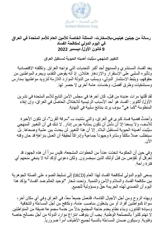 وأكدت، "بهذه الروح ومن أجل الأجيال القادمة، فلنعمل جميعاً معاً في العراق وفي اي مكان اخر، سواء كمواطنين افراد أو من يشغلون مناصب عامة، ونكافح من أجل المساءلة والشفافية وسيادة القانون، وبناء نظام يخدم حاجة المجتمع بدلاً من خدمة مجموعة ضيقة من المتواطئين لا تهتم كثيراً بالمصلحة العامة، ويجب أن يتوقف انتزاع موارد الدولة من اجل مصالح خاصة وفئوية، وسيكون ضمان المساءلة بالنسبة لجميع الاطياف أمراً ضرورياً".