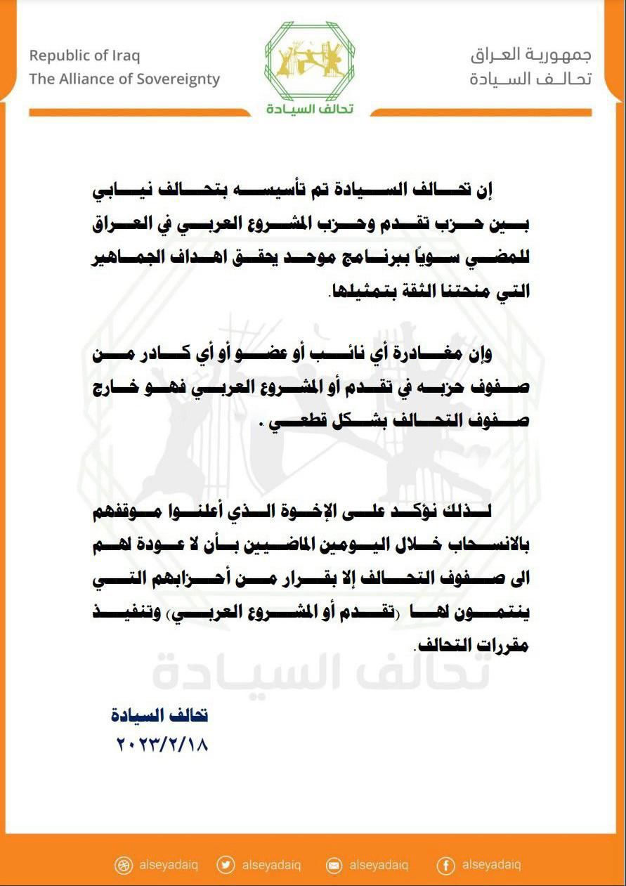أصدر تحالف السيادة، اليوم السبت، توضيحاً بشأن الانسحابات الأخيرة.