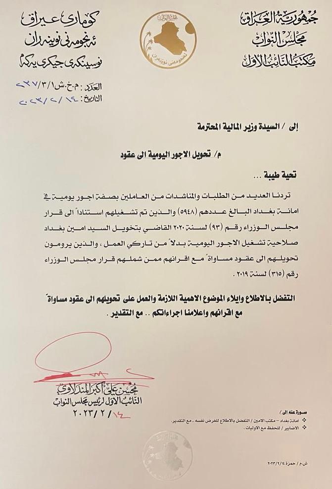 المندلاوي يدعو المالية لتحويل الأجور اليومية بأمانة بغداد إلى عقود (وثيقة)