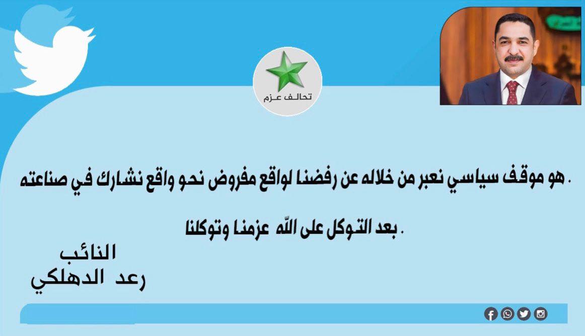 وكان الدهلكي، قد أعلن في 15 كانون الثاني 2023، انسحابه من تحالف السيادة، فيما وصف أسباب انسحابه بـ"الجوهرية".