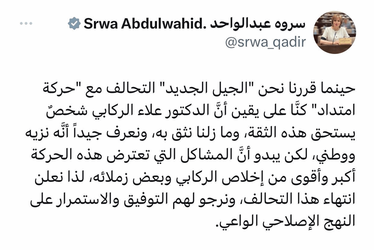 أعلنت كتلة "الجيل الجديد"، اليوم الثلاثاء، انتهاء تحالفها مع