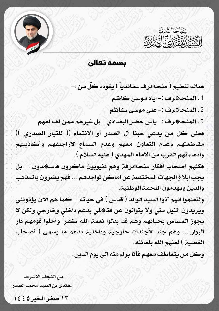 لا يتوانون عن قتلي.. الصدر يحذر من تنظيم منحرف ويدعو الى مقاطعته