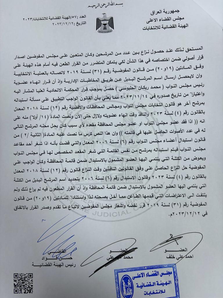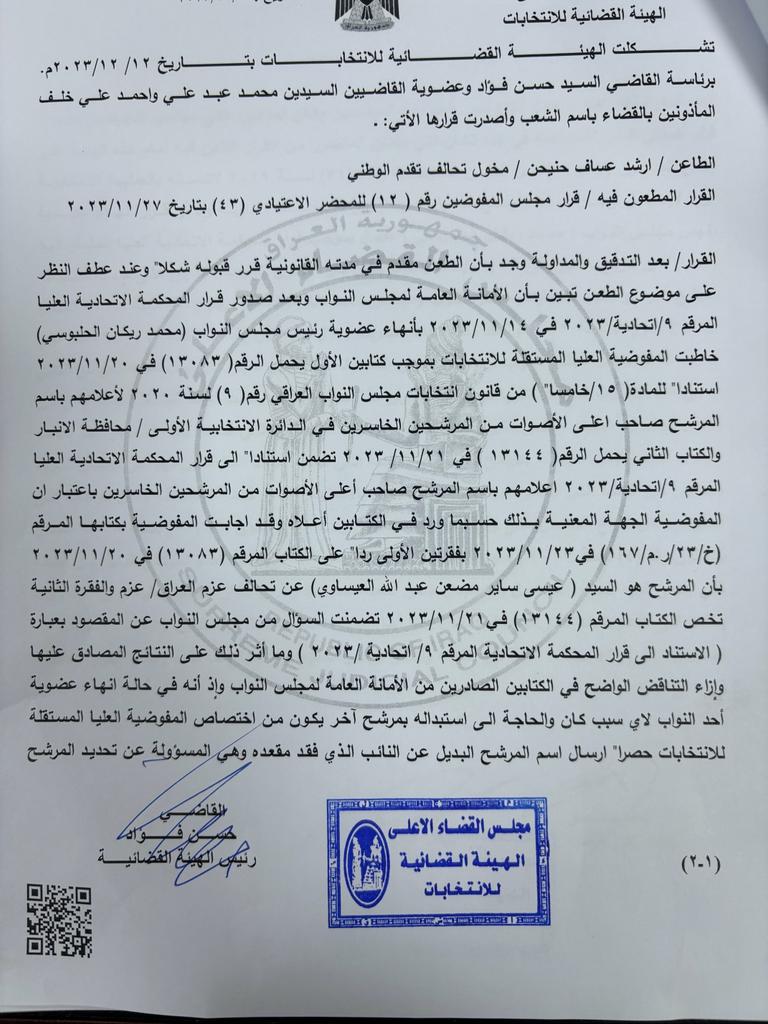 ، في (14 تشرين الثاني 2023)، حكماً بإنهاء عضوية رئيس