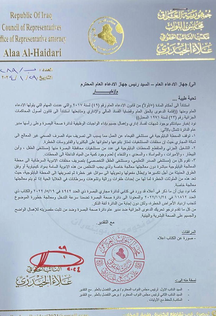 -كما نود بيان أن ما ذكر في أعلاه قد ورد في كتابي لدائرة مجاري البصرة ذي العدد ٤٩٤٢ في ٢٠٢٢/٥/١٩ والكتاب ذي العدد ١١٨٦٢ في ۲۰۲۲/۱۱/۲٤ والمعنونا الى دائرة صحة البصرة تضمنا سرعة التدخل ومعالجة خطورة الموضوع لتجنب ازدياد الأمراض الخطرة، ولكن دون إجابة من الدائرة آنفة الذكر.