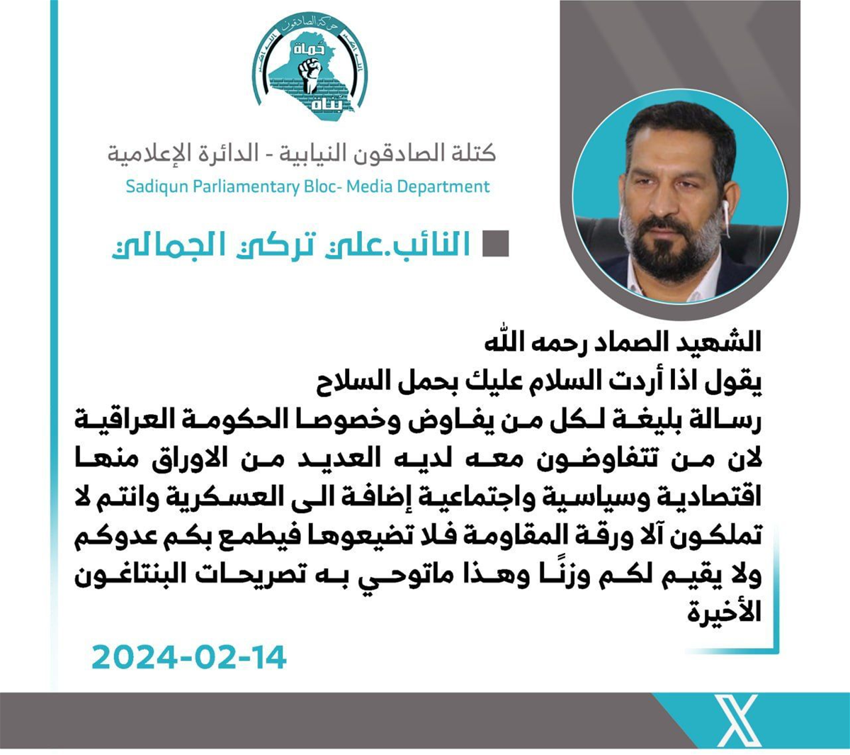 لان من تتفاوضون معه لديه العديد من الاوراق منها اقتصادية وسياسية واجتماعية إضافة الى العسكرية وأنتم لا تملكون آلا ورقة المقاومة فلا تضيعوها فيطمع بكم عدوكم ولا يقيم لكم وزنا وهذا ما توحي به تصريحات البنتاغون الأخيرة.