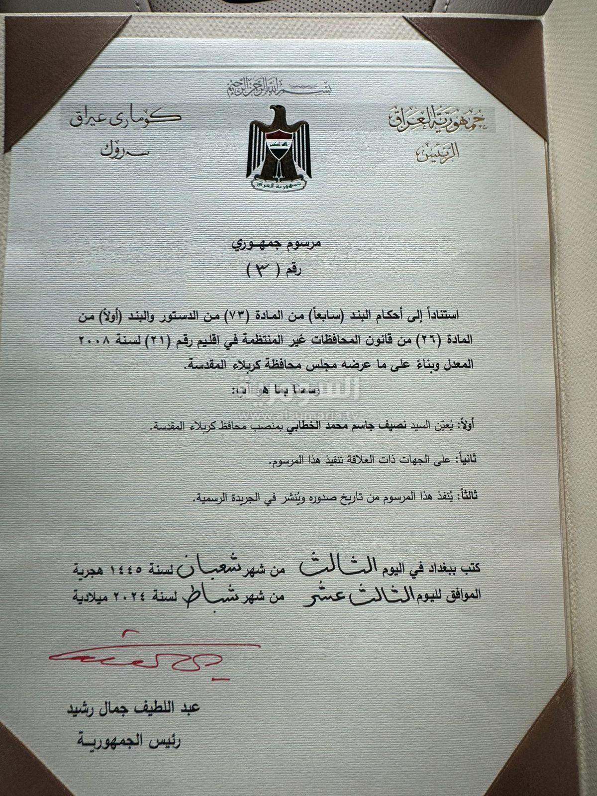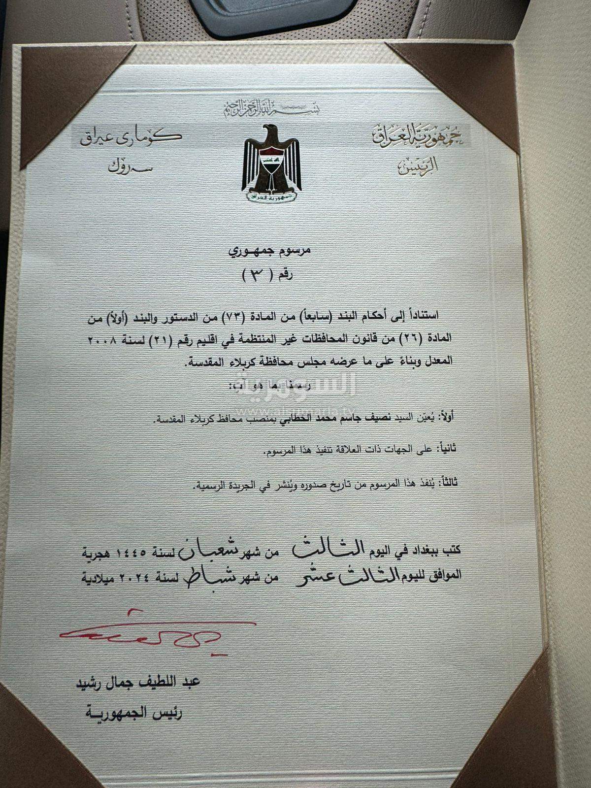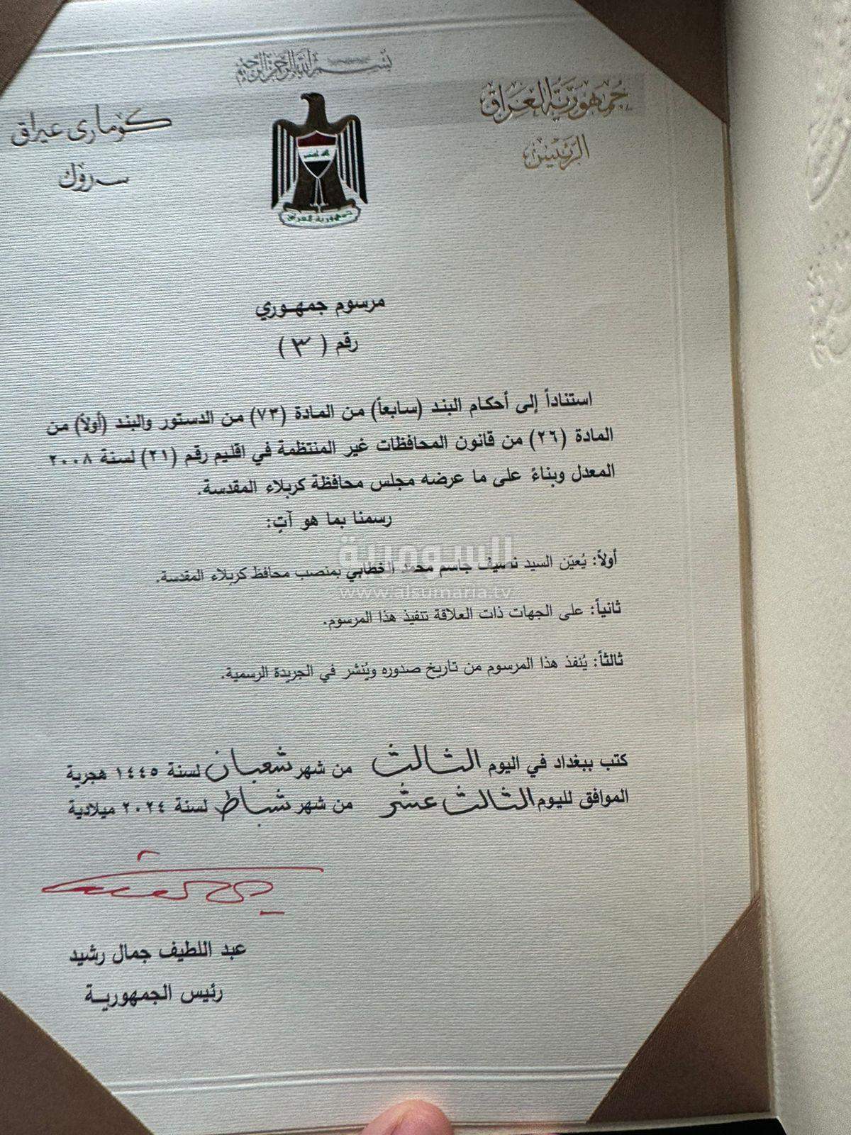 محافظ كربلاء يستلم المرسوم الجمهوري الخاص به (صور)