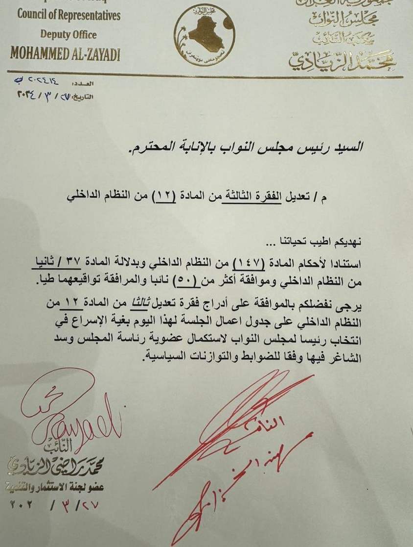 بالانابة، بعرض تعديل المادة 12 من النظام الداخلي على جدول الاعمال للاسراع بانتحاب رئيس جديد للبرلمان.
