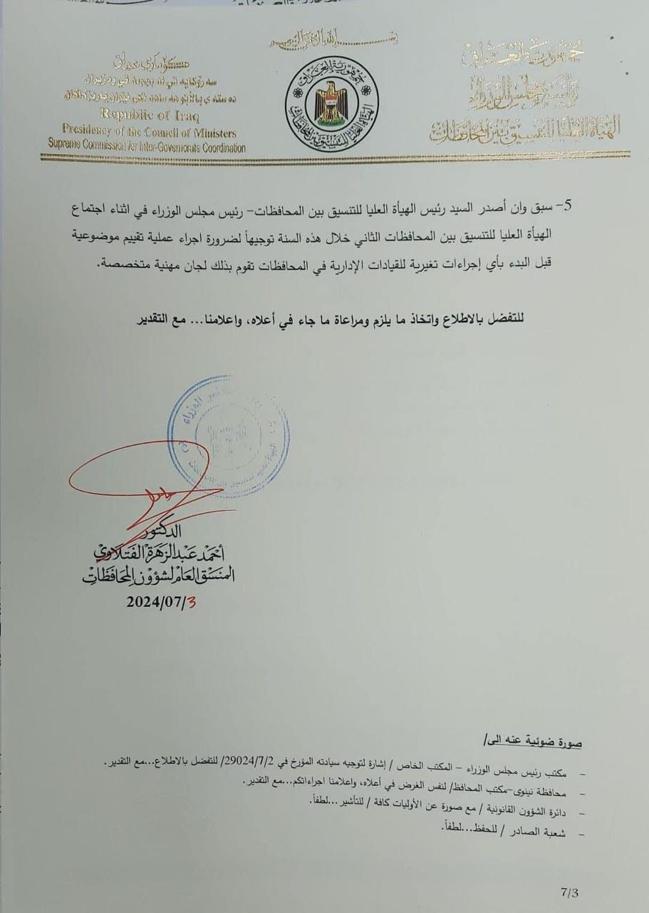 الأخيرة بتغيير مسؤولي الأقضية والنواحي في المحافظة بأنها "انقلاب على الدستور والقوانين".