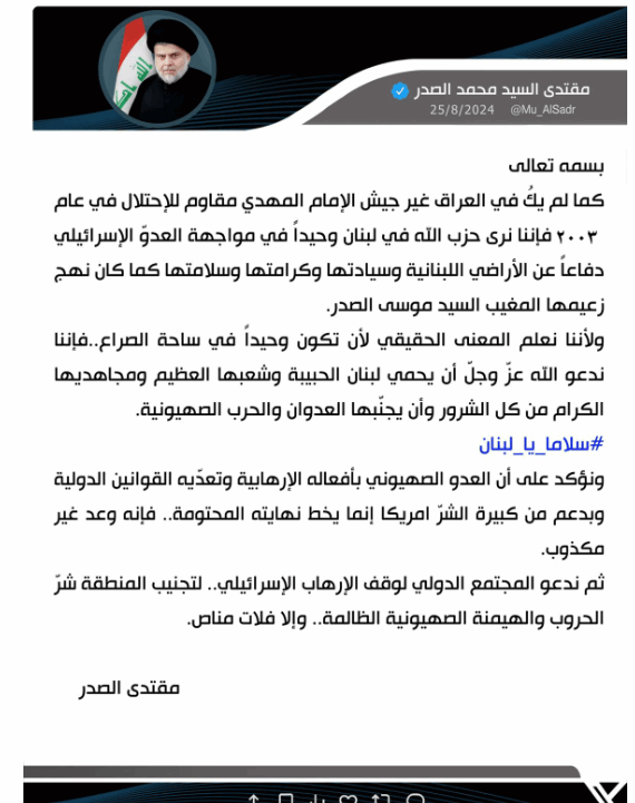السيد الصدر يشبه حزب الله اللبناني بجيش المهدي: وحيد في مواجهة الاحتلال