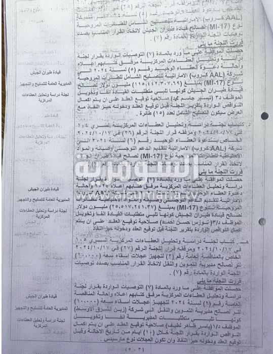 وقال المصدر للسومرية نيوز، ان "واحدة من المخالفات في عقود التسليح بوزارة الدفاع تتمثل بعقود صيانة الطائرات المروحية Mi17 وMi35 وMi28 "، مشيرا الى ان "ثلاثة عقود صيانة تمت احالتها الى شركة ( AAL) الإماراتية بأسلوب التعاقد كعطاء وحيد".
