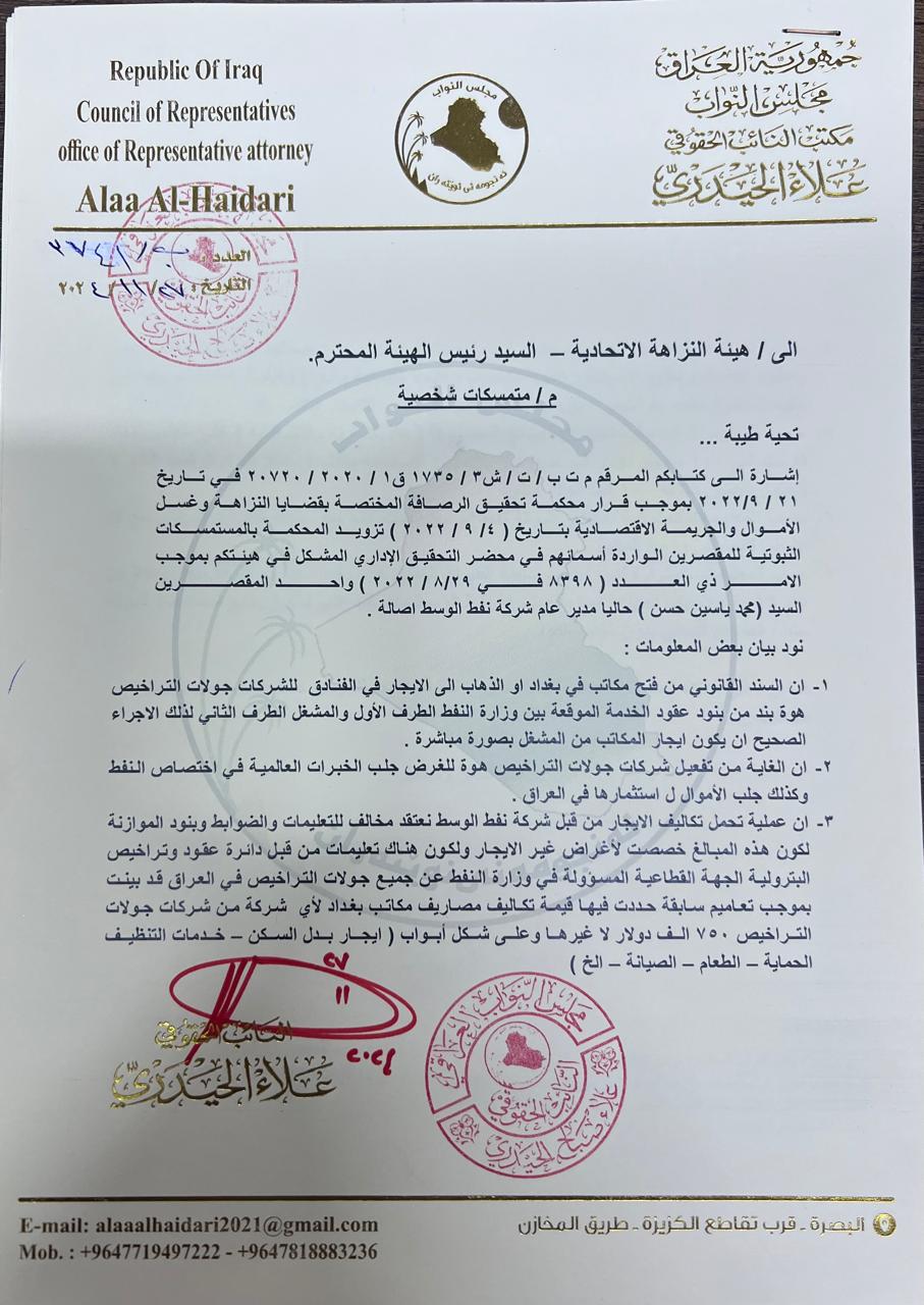 المختصة بقضايا النزاهة وغسل الأموال والجريمة الاقتصادية، بالمستمسكات الثبوتية للمقصرين الواردة أسمائهم في محضر التحقيق الإداري المشكل في هيئتكم، واحد المقصرين (محمد