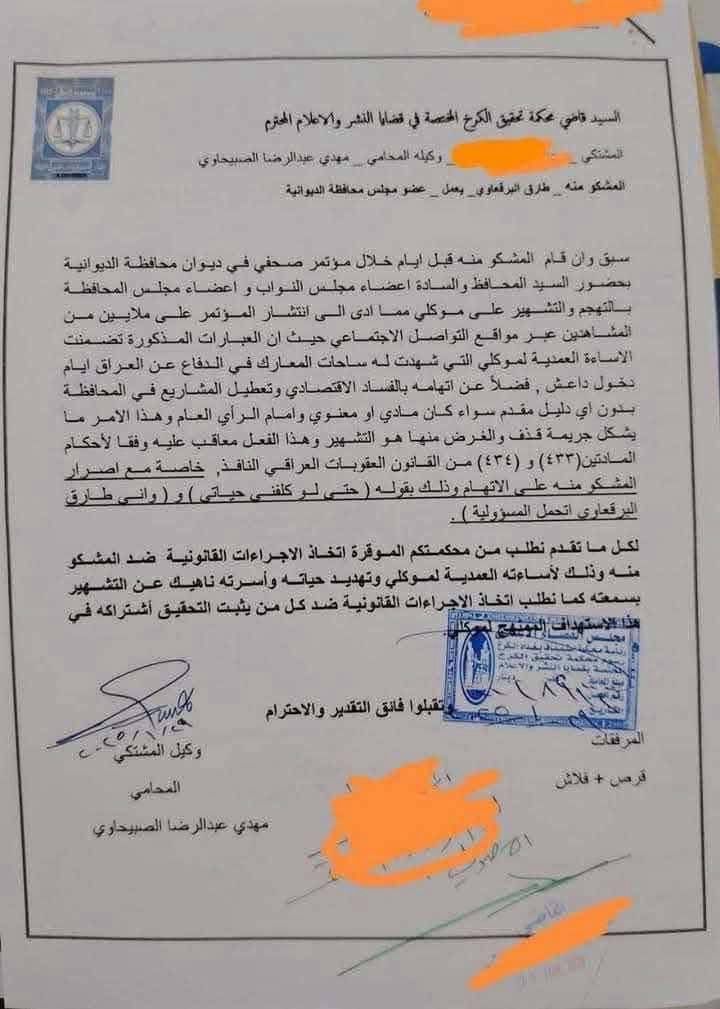 واعضاء مجلس المحافظة بالتهجم والتشهير على موكلي مما ادى الى انتشار المؤتمر على ملايين من المشاهدين عبر مواقع التواصل الاجتماعي".
