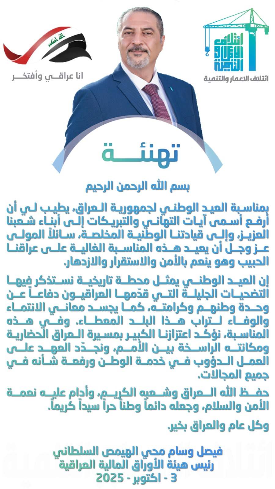 رئيس هيئة الأوراق المالية يهنئ بالعيد الوطني العراقي: نستذكر التضحيات الجليلة
