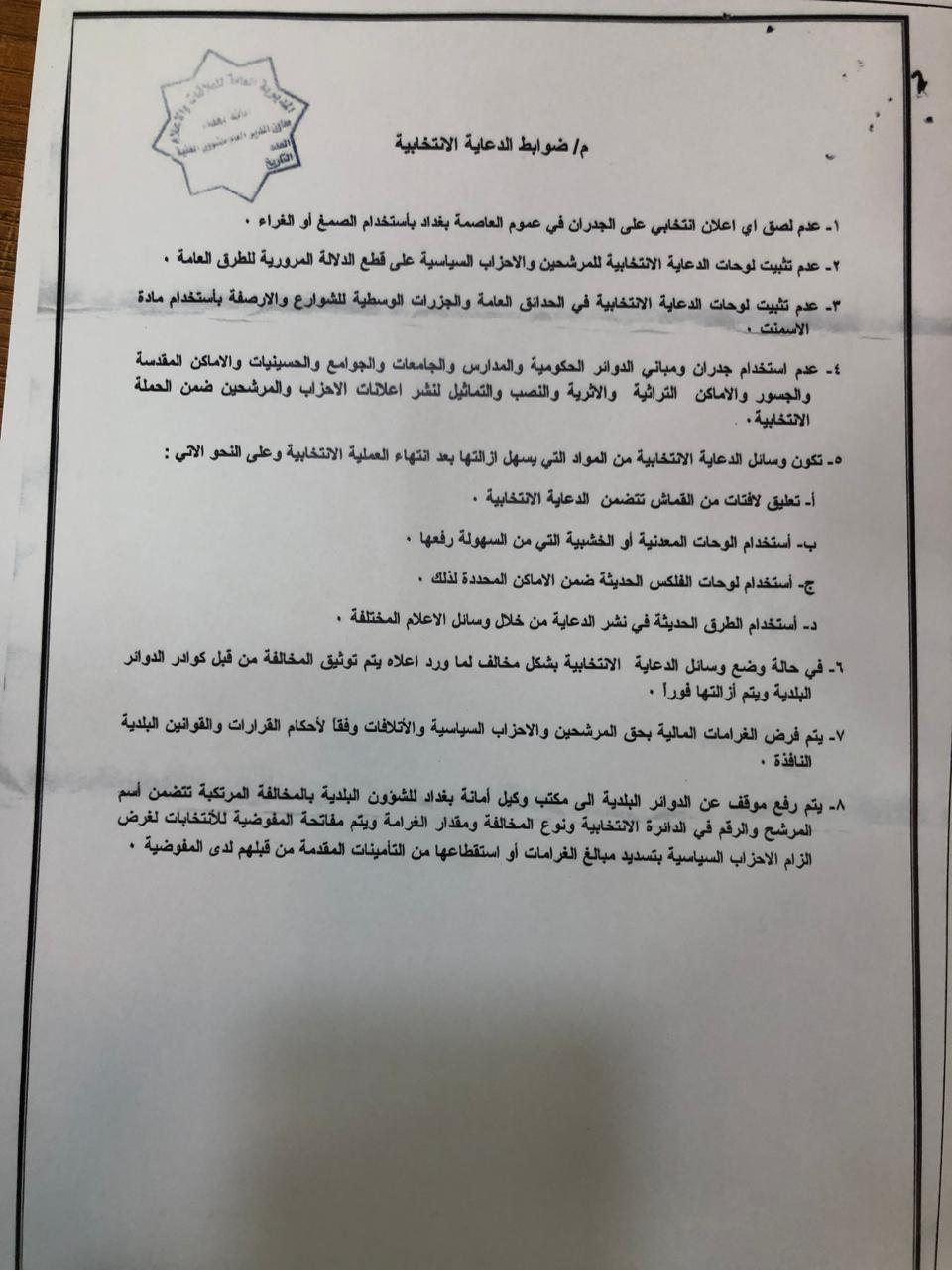 من 8 نقاط.. أمانة بغداد تصدر تعليمات وضوابط الدعاية الانتخابية للمرشحين (وثائق)