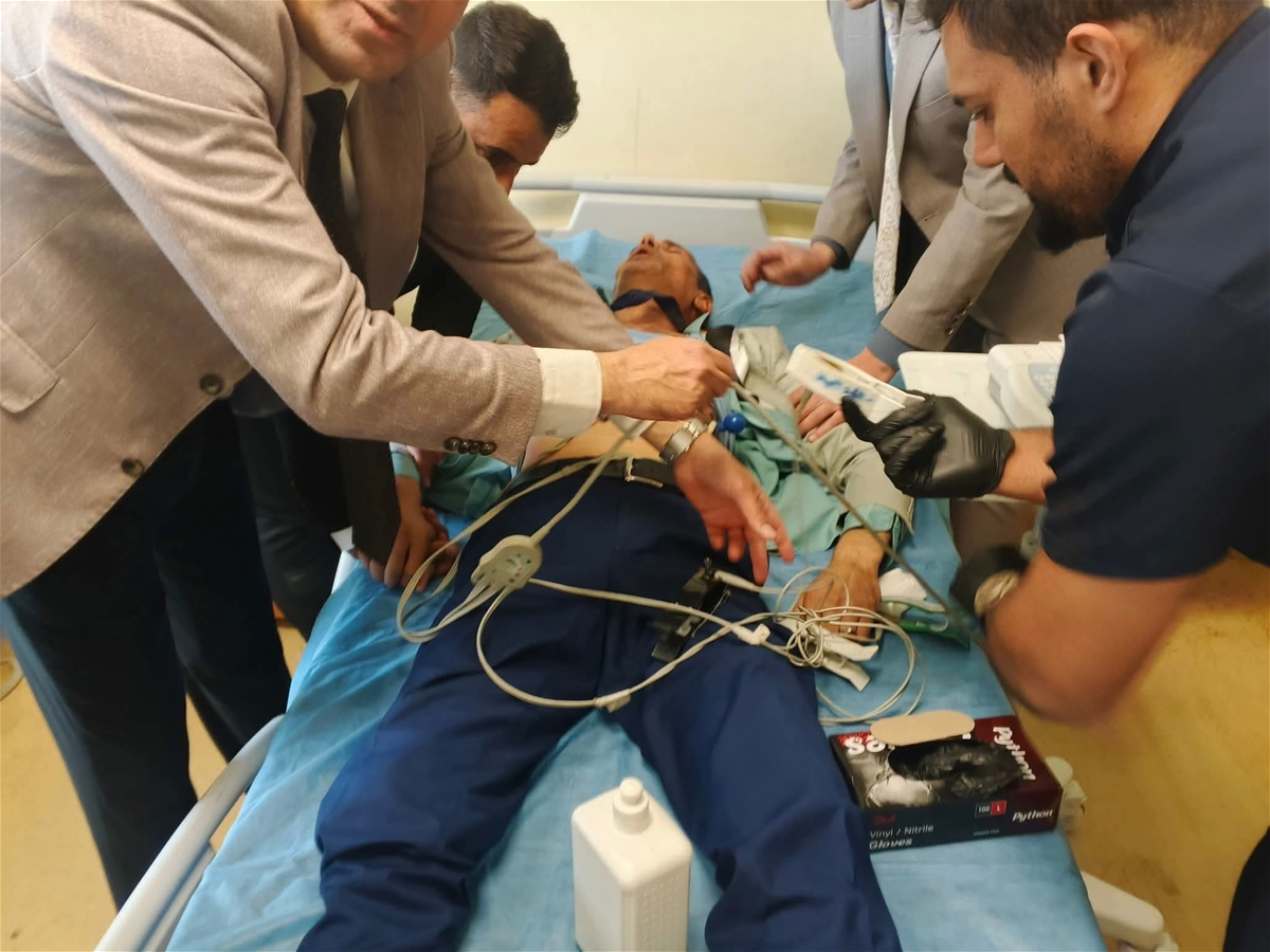 اثناء نقله الى المستشفى على كرسي متحرك، فضلا عن صور من داخل المستشفى خلال عملية الكشف عليه من قبل الأطباء.