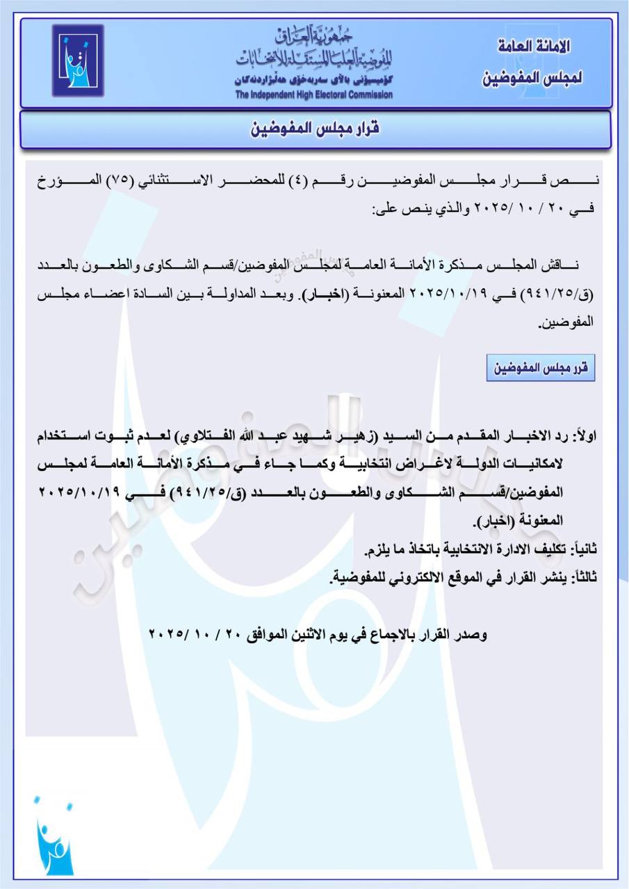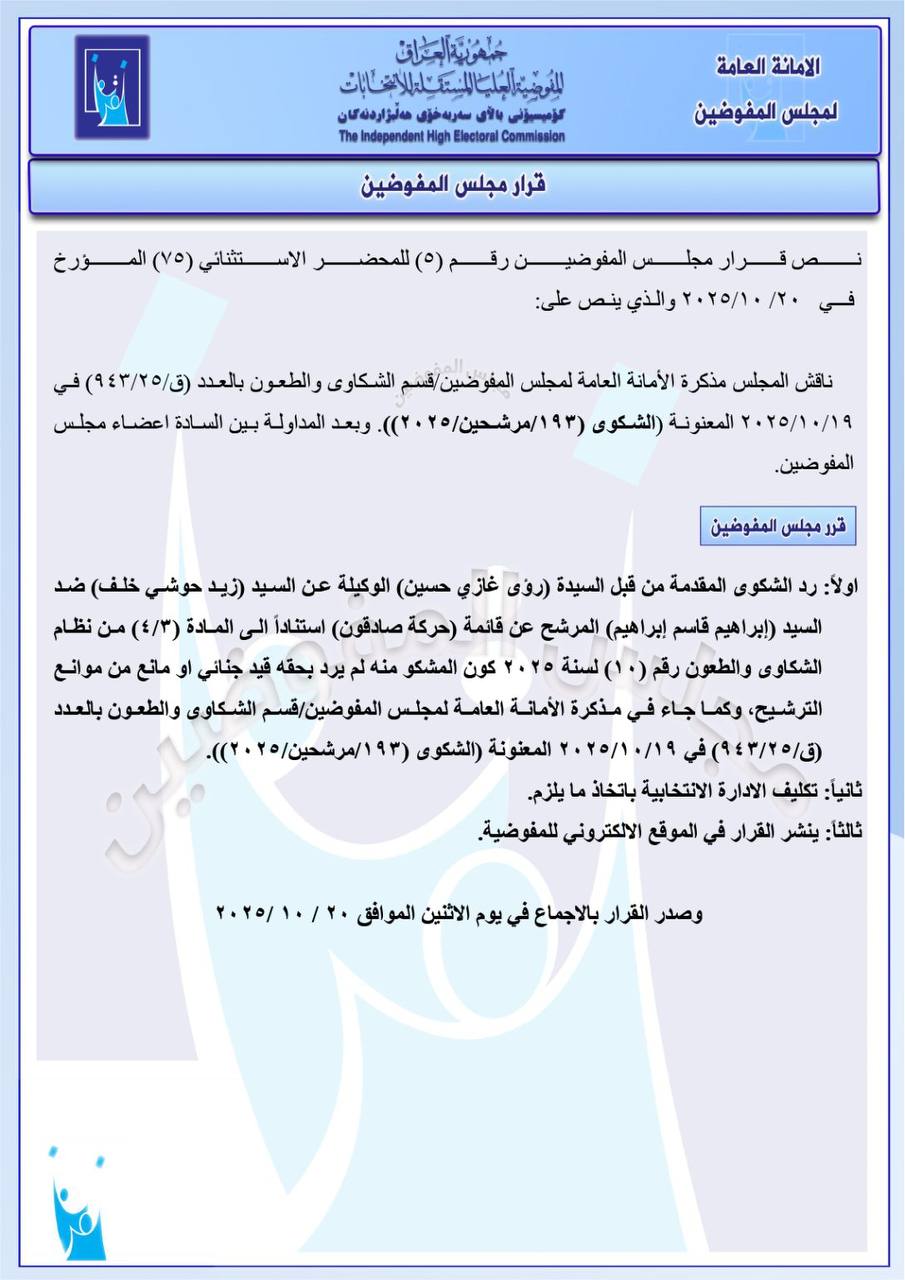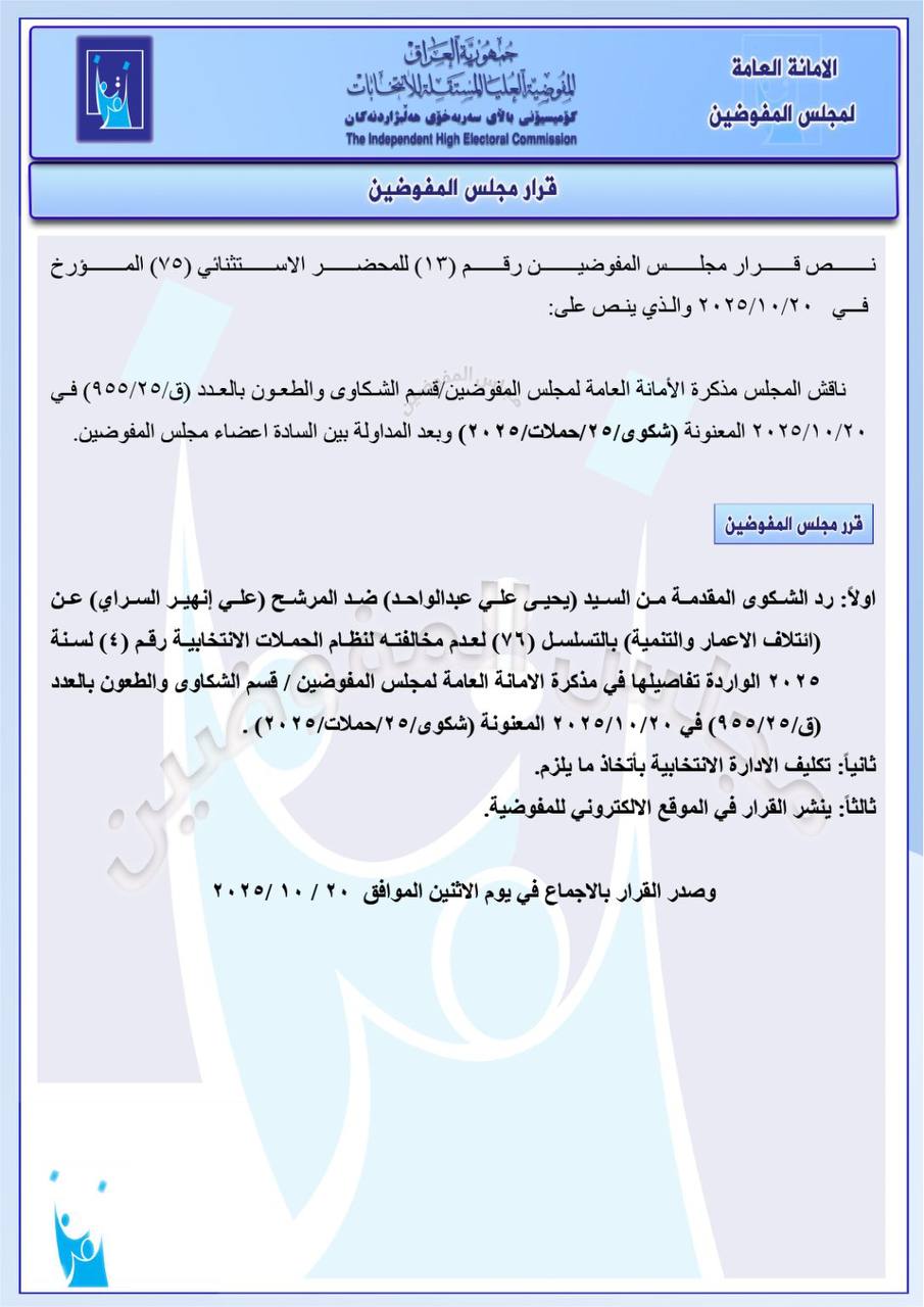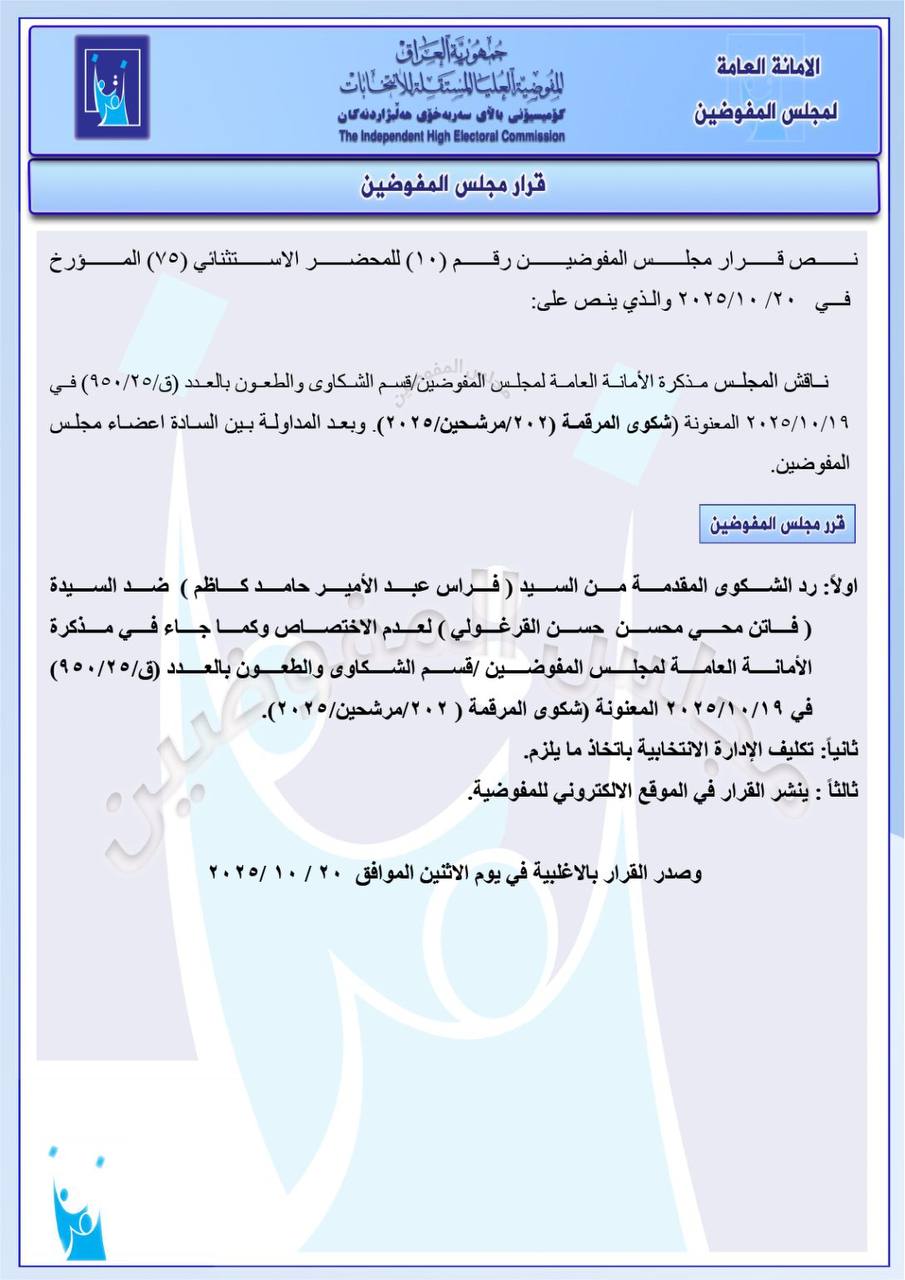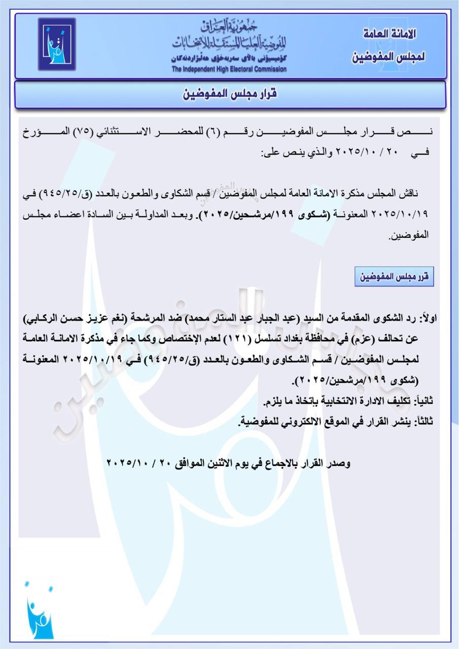 ، مجموعة من القرارات الخاصة بالشكاوى والطعون المقدمة ضد عدد من المرشحين والقوائم الانتخابية، وذلك استناداً إلى المذكرات المرفوعة من