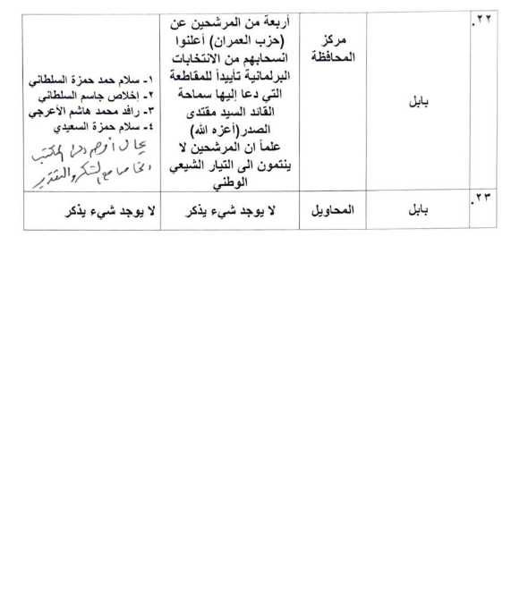 من جانبه، وجه السيد الصدر بإحالة امر هؤلاء المرشحين المنسحبين الى المكتب الخاص وتقديم الشكر لهم.