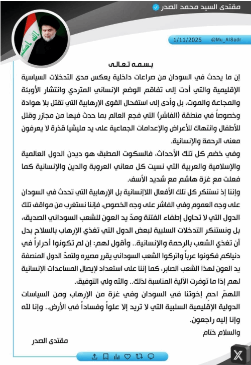 السيد الصدر يعلن استعداده لمساعدة الشعب السوداني ويستنكر "إرهاب الميليشيا القذرة"