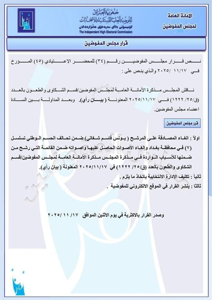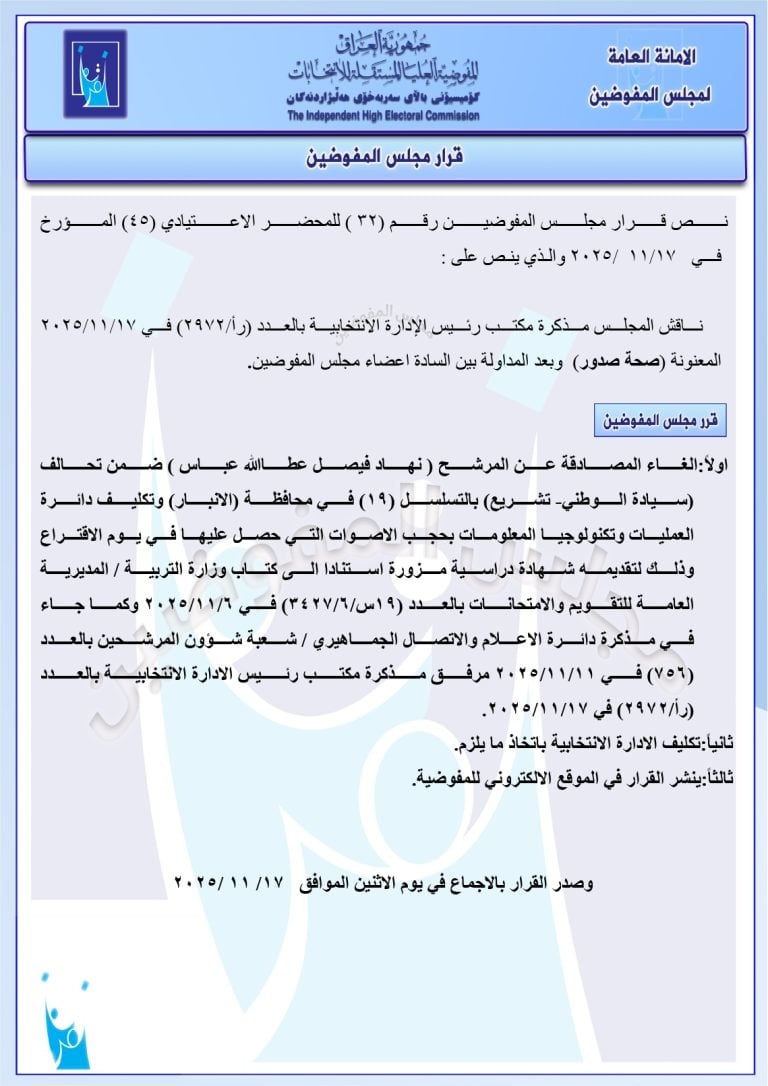 المفوضية تعلن استبعاد 6 مرشحين وحجب أصواتهم الانتخابية (وثائق)