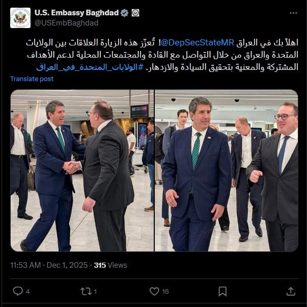 تدوينة مصحوبة بصورتين لوصول ريغاس جاء فيها "اهلاً بك في العراق. تُعزّز هذه الزيارة العلاقات بين
