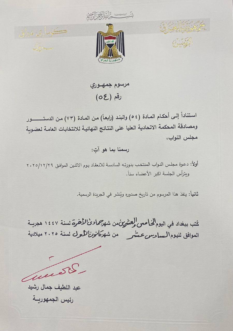 بالوثيقة.. رئيس الجمهورية يحدد الـ29 من كانون الأول موعد الجلسة الاولى للبرلمان