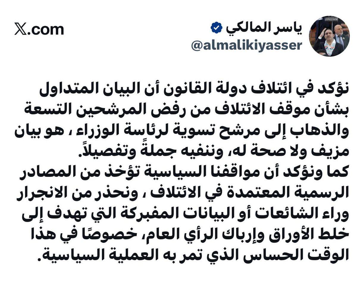 ، "نؤكد في ائتلاف دولة القانون أن البيان المتداول بشأن موقف الائتلاف من رفض المرشحين التسعة والذهاب إلى مرشح تسوية لرئاسة الوزراء، هو بيان مزيف ولا صحة له، وننفيه جملة وتفصيلاً".
