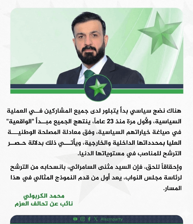 الكربولي يتحدث عن "نضج سياسي يحدث لأول مرة": السامرائي اول من قدم النموذج