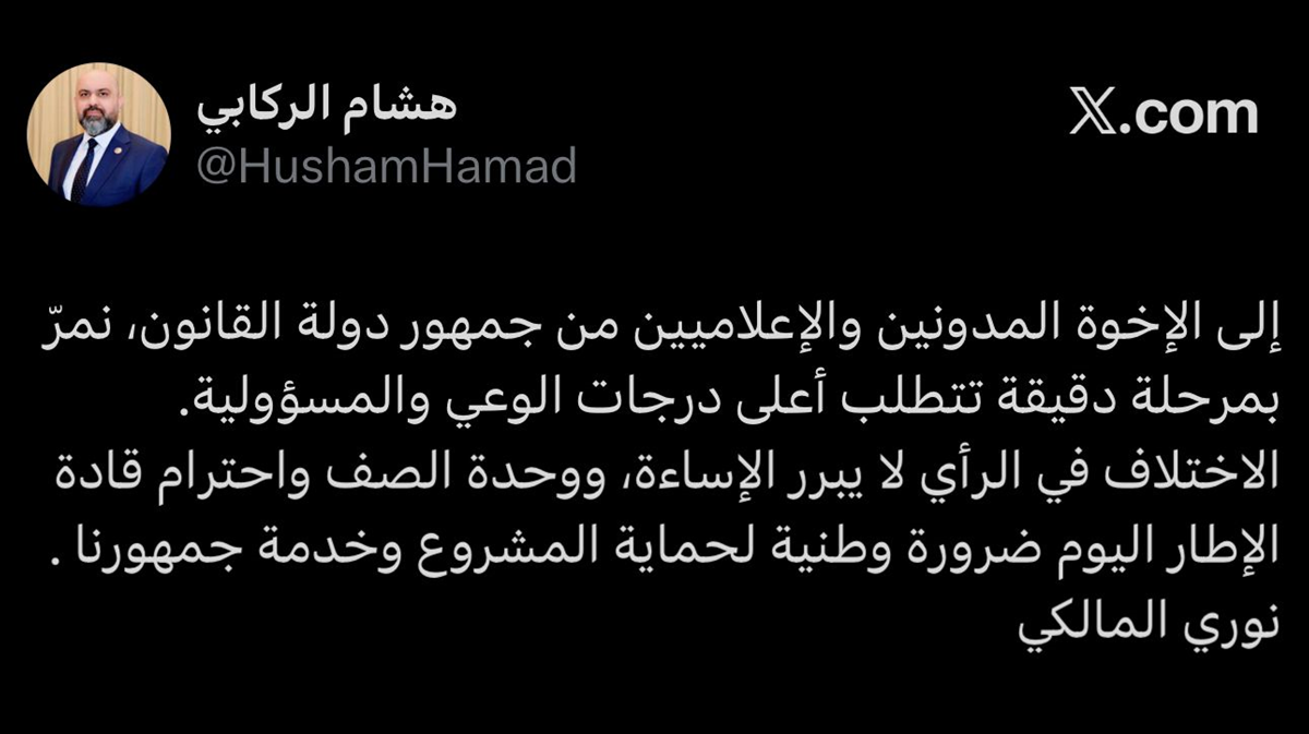 وأضاف ان "الاختلاف في الرأي لا يبرر الإساءة"، موضحا ان "وحدة الصف واحترام قادة الإطار اليوم ضرورة وطنية لحماية المشروع وخدمة جمهورنا".