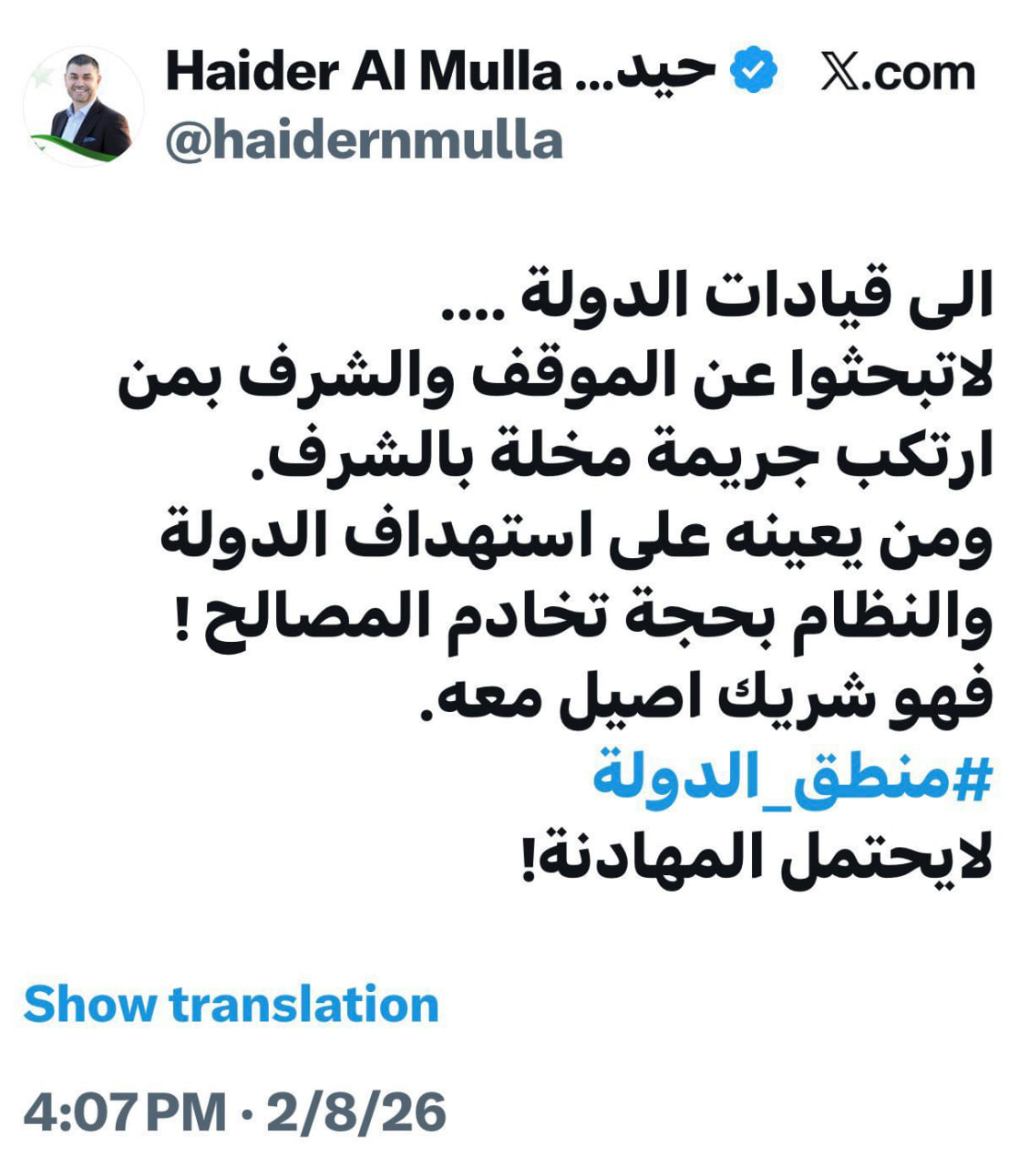 ولم يكتفِ الملا بالانتقاد، بل ذهب إلى توجيه اتهام مباشر لكل من يوفر الدعم لهذه الشخصيات، قائلاً: "من يعينه على استهداف الدولة فهو شريك معه".
