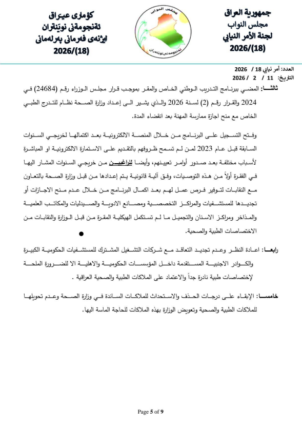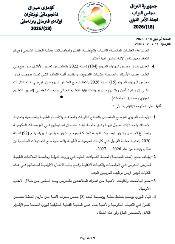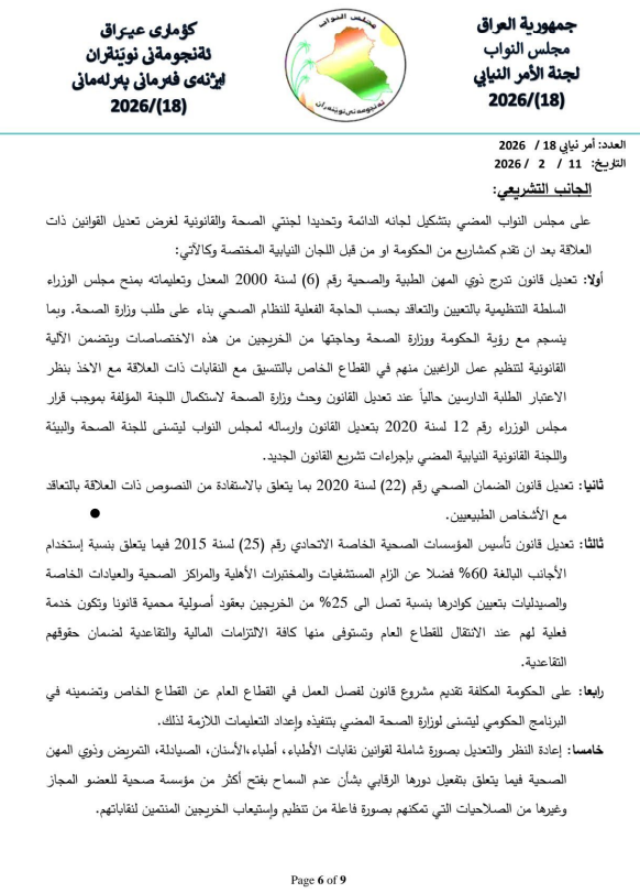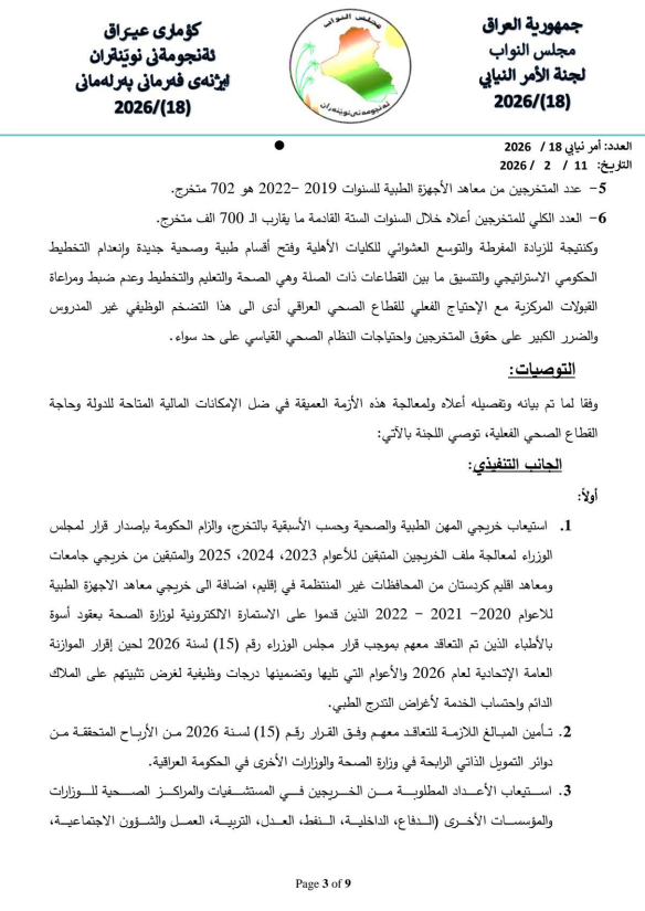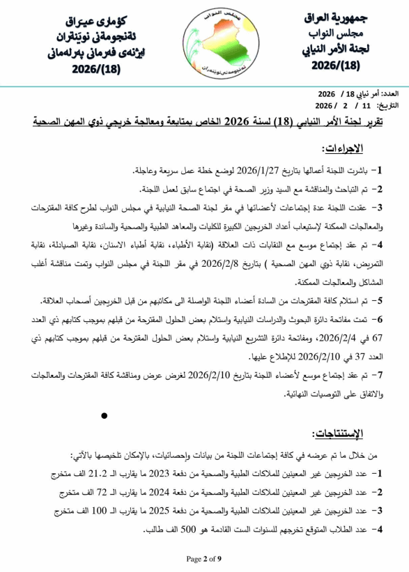 نيوز، اليوم الأحد، التوصيات النهائية للجنة الأمر النيابي رقم (18) لسنة 2026 الخاصة بمتابعة ومعالجة أوضاع خريجي ذوي المهن الطبية والصحية.