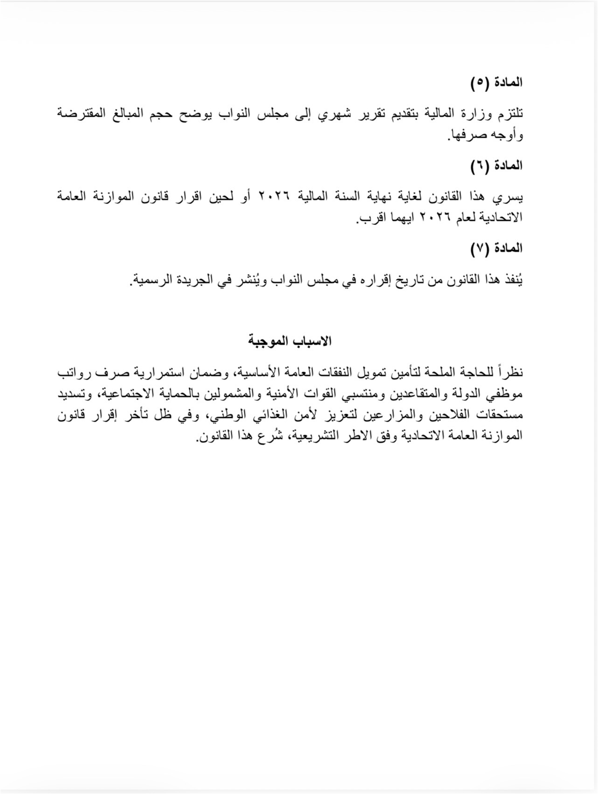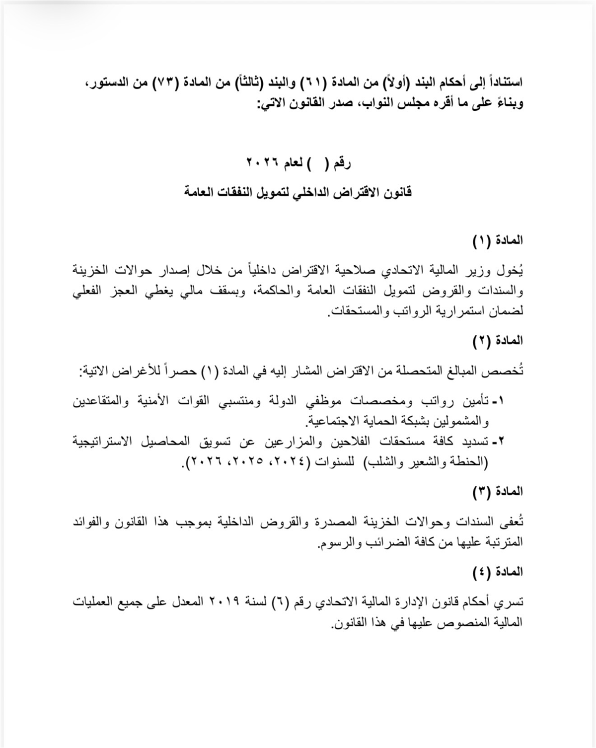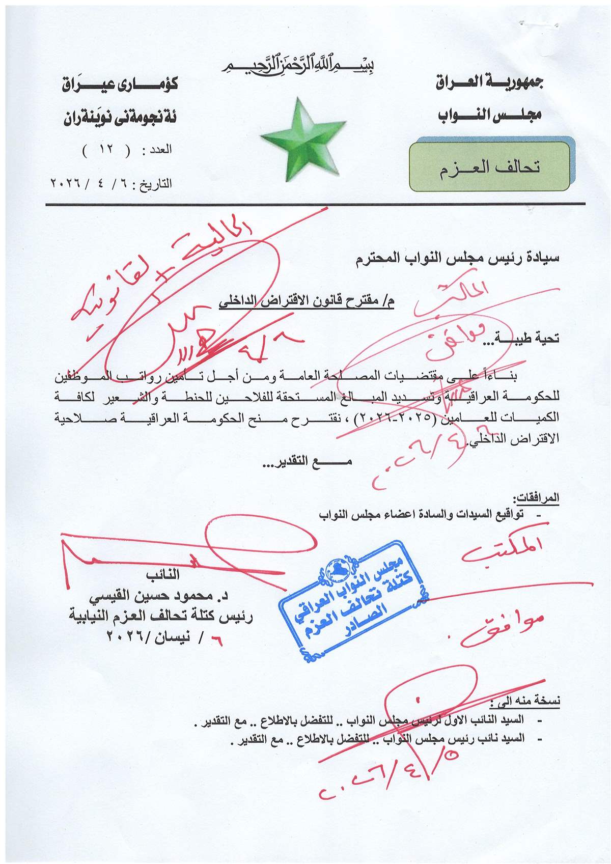 تبنى تحالف العزم، اليوم الاثنين، قانون الاقتراض الداخلي لتأمين رواتب الموظفين والرعاية الاجتماعية ومستحقات الفلاحين عن محاصيل الحنطة والشعير والشلب عن عامي 2025-2026.