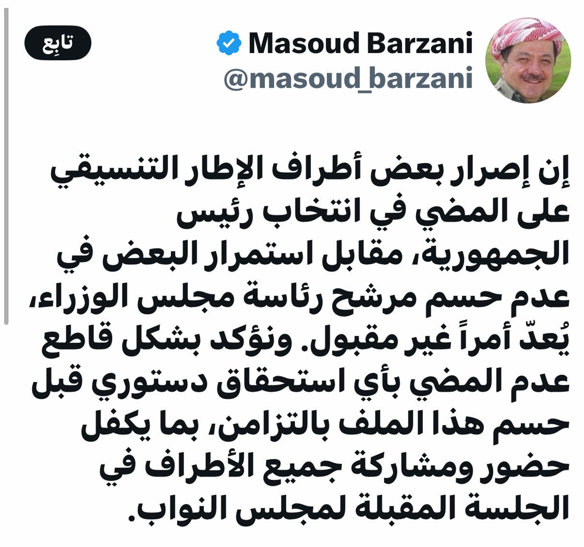 وتابع "نؤكد بشكل قاطع عدم المضي بأي استحقاق دستوري قبل هذا الملف بالتزامن، بما يكفل حضور ومشاركة جميع الأطراف في الجلسة المقبلة لمجلس النواب".