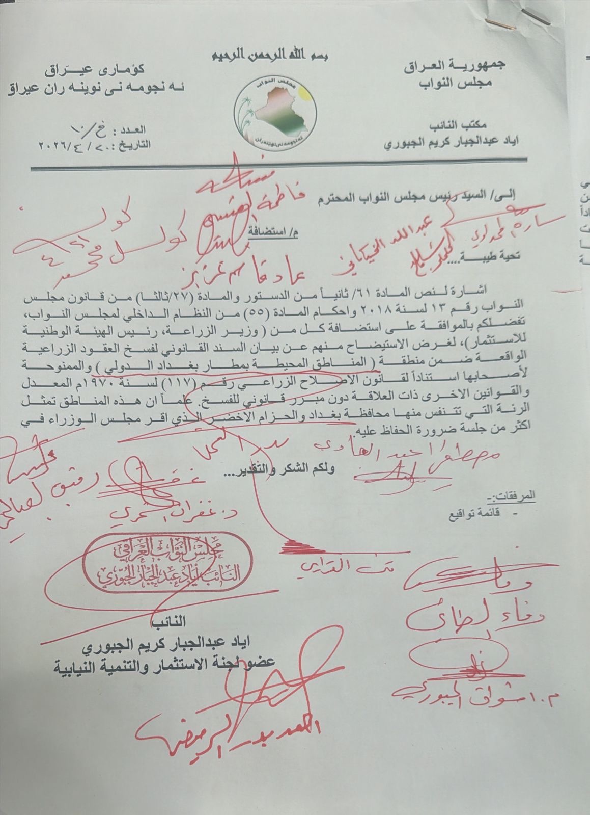 بالوثيقة.. جمع تواقيع لاستضافة رئيس هيئة الاستثمار بالبرلمان بشان الاراضي قرب مطار بغداد