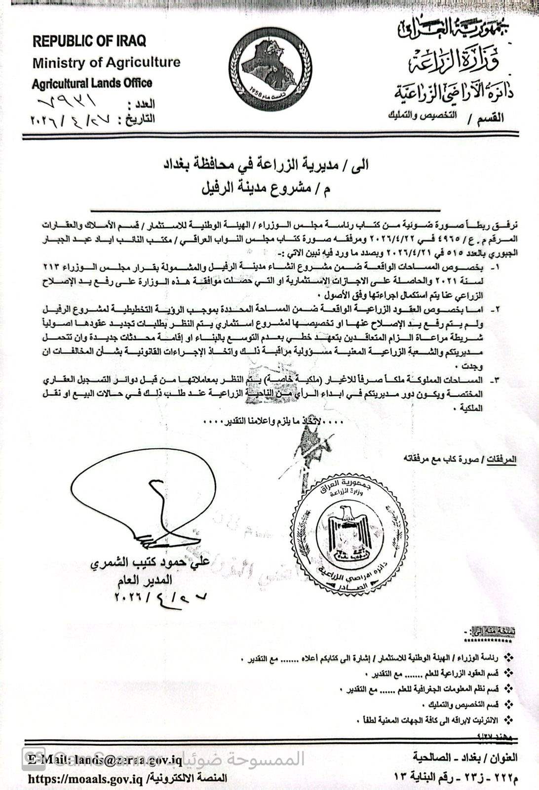 النائب الجبوري يعلن المباشرة بتجديد العقود الزراعية لمناطق محيط مطار بغداد