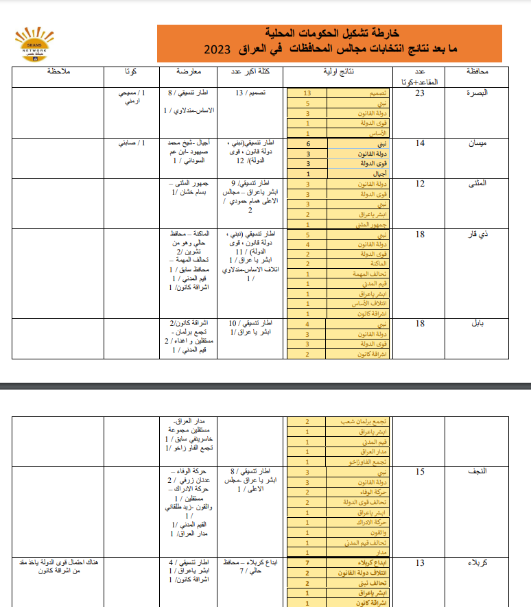 أوجزت شبكة شمس لمراقبة الانتخابات اليوم الاثنين، خارطة عدد المقاعد وتشكيل الحكومات المحلية في المحافظات العراقية بناء على قانون سانت ليغو، واعتمادا على عدد الأصوات التي حصلت عليها كل كتلة وتحالف وحزب.