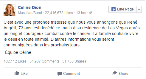 سيلين ديون تعلن وفاة زوجها بعد صراع مع السرطان