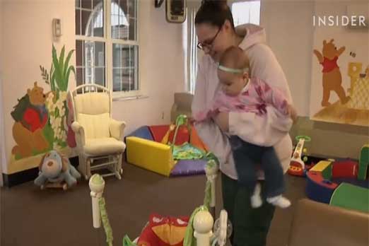 هكذا تقضي الأمّ جينفير أيّامها في الحضانة الموجودة داخل السجن، وهي تحرص على رعاية طفلتها الصغيرة التي أصبحت تبلغ ستّة أشهر، علماَ أنه بين كلّ مئة سجن مخصّص للنساء في الولايات المتحدة ، توجد