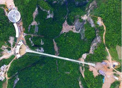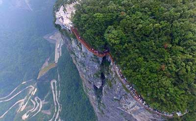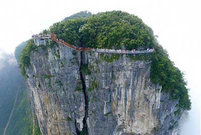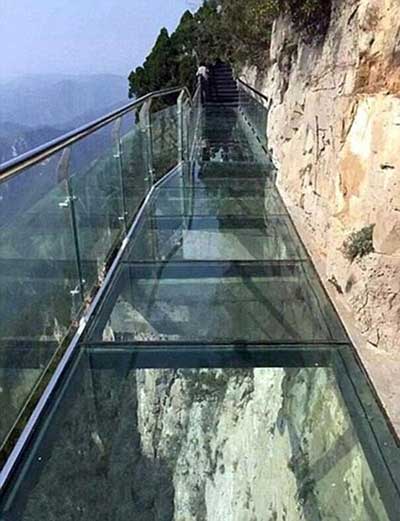 الممر الزجاجي ويدعى "كويلنج دراجون كليف"، تم افتتاحه في الصين في شهر كانون الاول /سبتمبر، وهو يلف حول قمة جبل "تيانمن" الواقع في حديقة "تيانمن شان" الوطنية بمقاطعة "هونان"، ويمر فوق وادٍ على ارتفاع 1402 م، ويبلغ عرض الممر متراً ونصف المتر فقط.