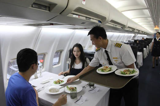 كما أشار إلى أنه رغم التشابه مع الطائرات فقد تم قلب القواعد المتبعة في تقديم الطعام بالطائرة، فالأكلات هناك مجهزة سلفاً وخفيفة في الغالب والتجربتان لا تتشابهان حتى لو تشابه المكان.