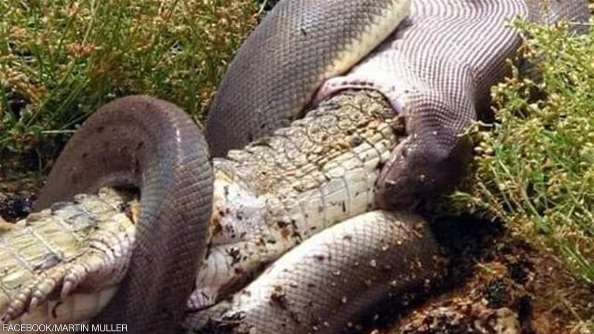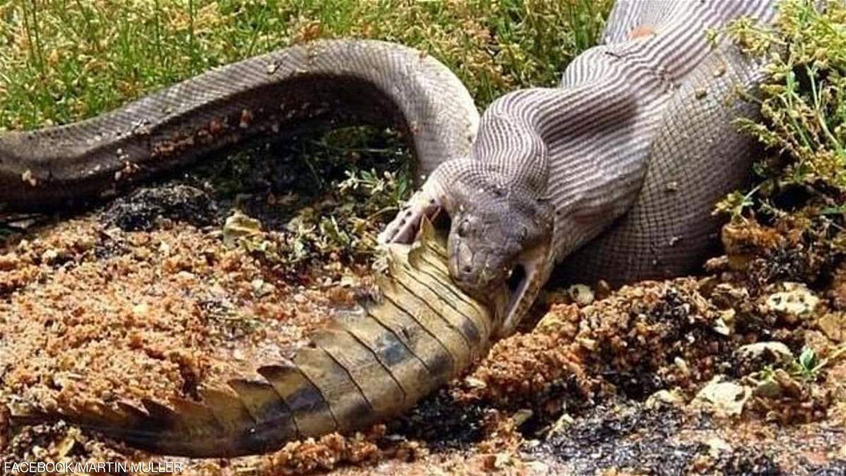 لقطات لا تصدق لأفعى تبتلع تمساحا ضخما