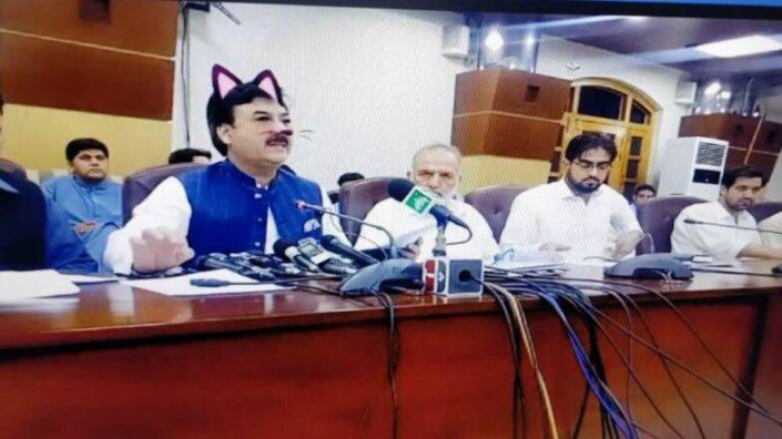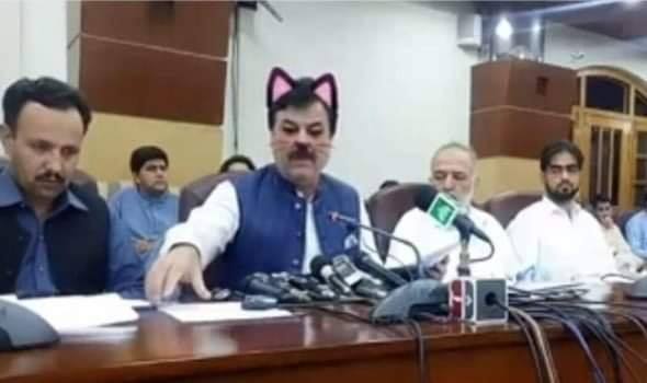 في واقعة طريفة، انتشرت صورا لوزير باكستاني خلال مؤتمر صحفي وهو يظهر بوجه القط ، الأمر الذي أثار موجة سخرية كبيرة، وذلك بعدما فعل أحد أفراد فريقه خاصية فلتر القطة المخصصة لتطبيقات التواصل الاجتماعي، أثناء بث مباشر له على موقع «فيسبوك» خلال مؤتمر صحفي، ليظهر الوزير بأُذني وشارب قطة، ما أثار موجةً كبيرةً من السخرية على الإنترنت.